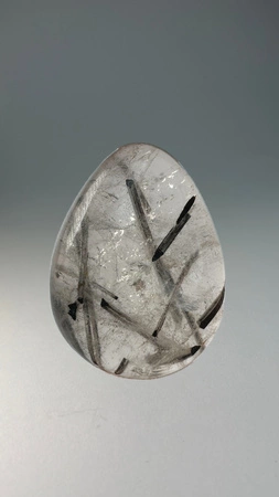 - Kwarc z czarnymi wrostkami rutylu łezka 29,4 x 22,2 x 11,6 mm. Masa kamienia naturalnego ok. 57,07 ct./szt.