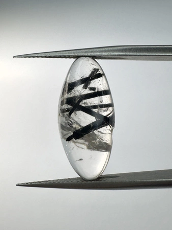 - Kwarc z czarnymi wrostkami rutylu markiza kaboszon 19,8 x 9,2 x 5,22 mm. Masa kamienia naturalnego ok. 6,44 ct./szt.