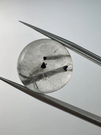 - Kwarc z czarnymi wrostkami rutylu okrągły kaboszon fi 16,5 mm i wysokości 7,34 mm. Masa kamienia naturalnego ok. 15,38 ct./szt.
