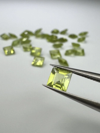 - Perydot oliwin kwadrat ok. 5x5 mm. masa kamienia naturalnego ok. 0,65ct./szt. Kamienie mogą posiadać naturalne mało widoczne inkluzje.