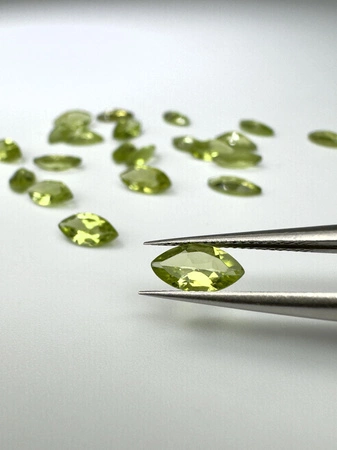 - Perydot oliwin markiza ok. 8x4 mm. masa kamienia naturalnego ok. 0,6ct./szt. Kamienie mogą posiadać naturalne mało widoczne inkluzje.