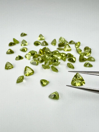 - Perydot oliwin trylion ok. 5x5 mm. masa kamienia naturalnego ok. 0,44ct./szt. Kamienie mogą posiadać naturalne mało widoczne inkluzje.