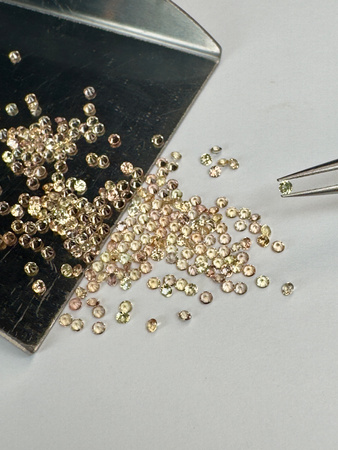 - Pastelowo cytrusowy szafir okrągły ok. 1,5 mm. masa kamienia naturalnego ok. 0,02075 ct./szt.