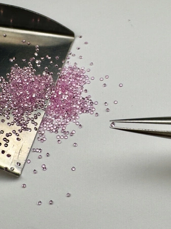 - Szafir różowy okrągły ok. 1 mm. masa kamienia naturalnego ok. 0,0055 ct./szt.