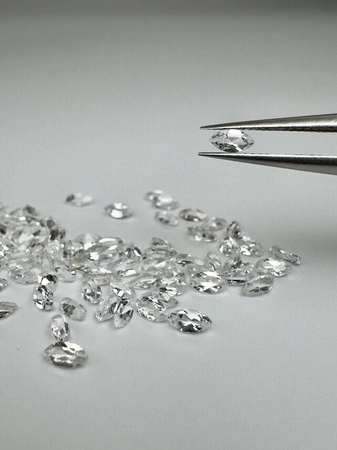 - Topaz biały markiza fasetowany ok. 4x2 mm. Masa kamienia naturalnego ok. 0,10 ct./szt. Posiadają mało widoczne inkluzje